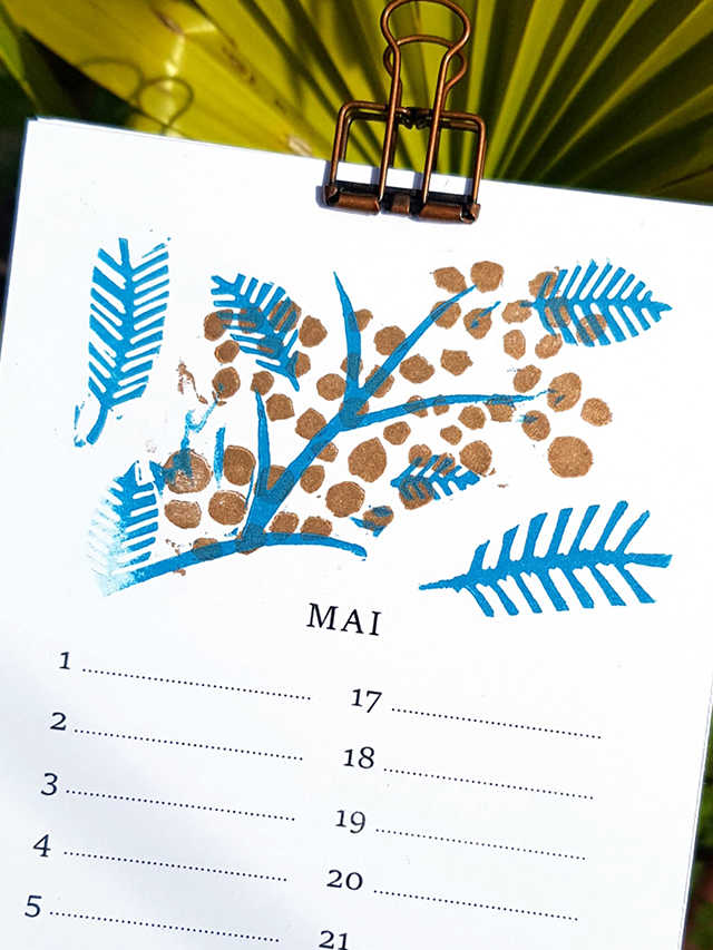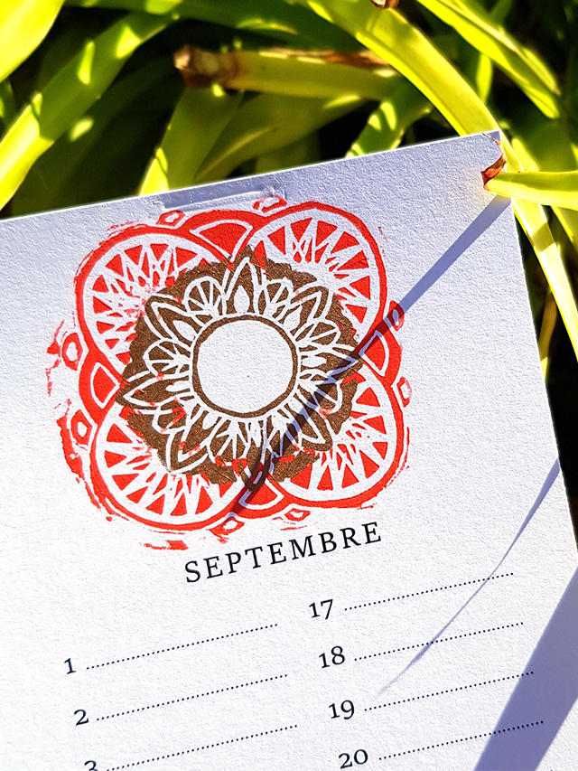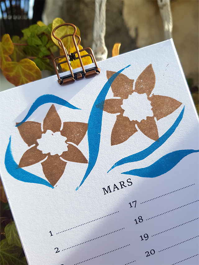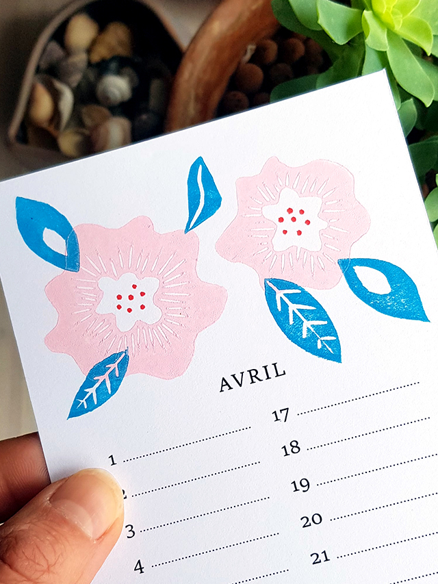 Calendrier format 10 x 21 cm composé d’une couverture et d’une page par mois.