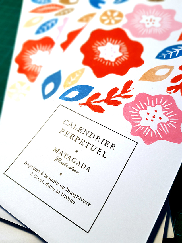Impression de motifs en linogravure 4 couleurs : bleu, rouge, rose et or.