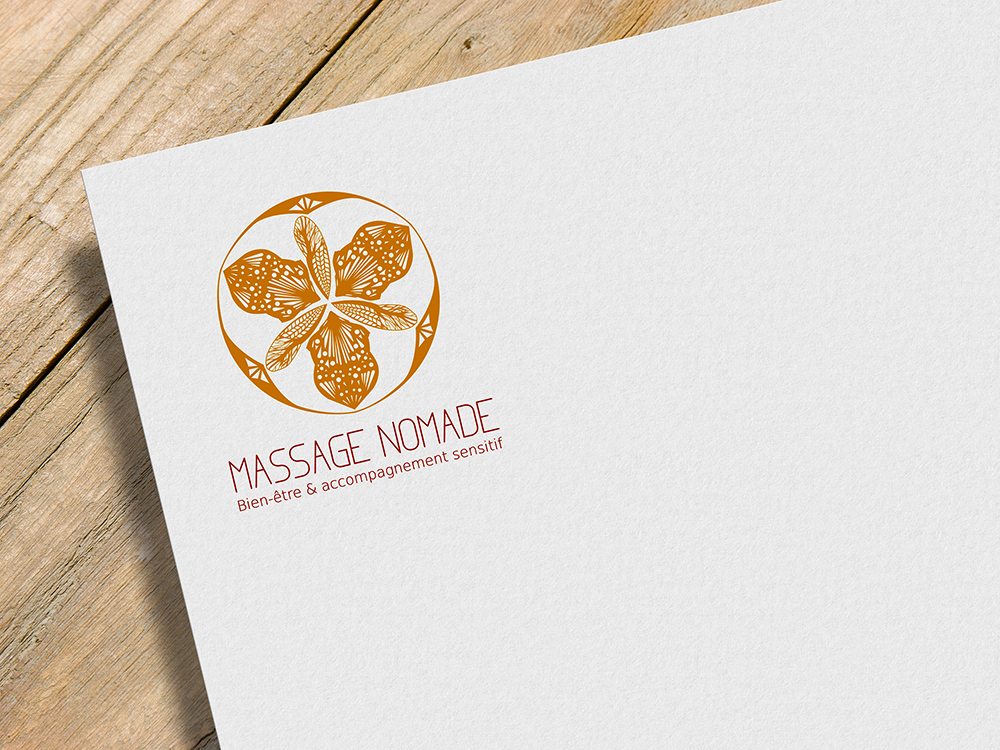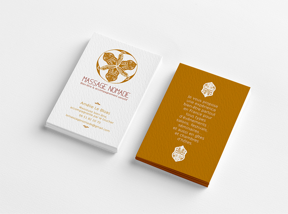 Création graphique du logo et de la carte de visite pour Massage Nomade – Bien-être & accompagnement sensitif (devenu par la suite Alchémilla), situé dans le Gard.